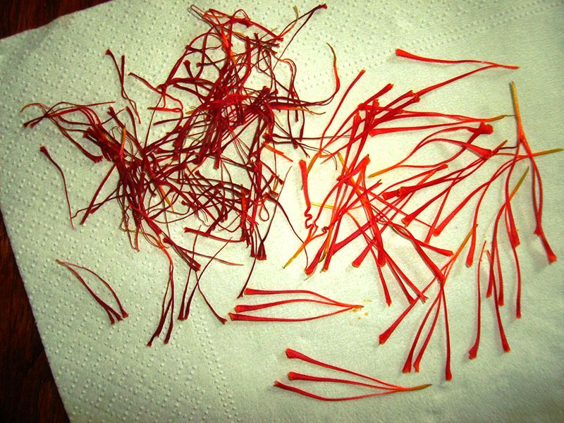 - L'opération de séchage est essentielle, c'est elle qui confère sa qualité au safran. Il perd 80 % de son poids et devient rouge vif, sec, cassant et léger.